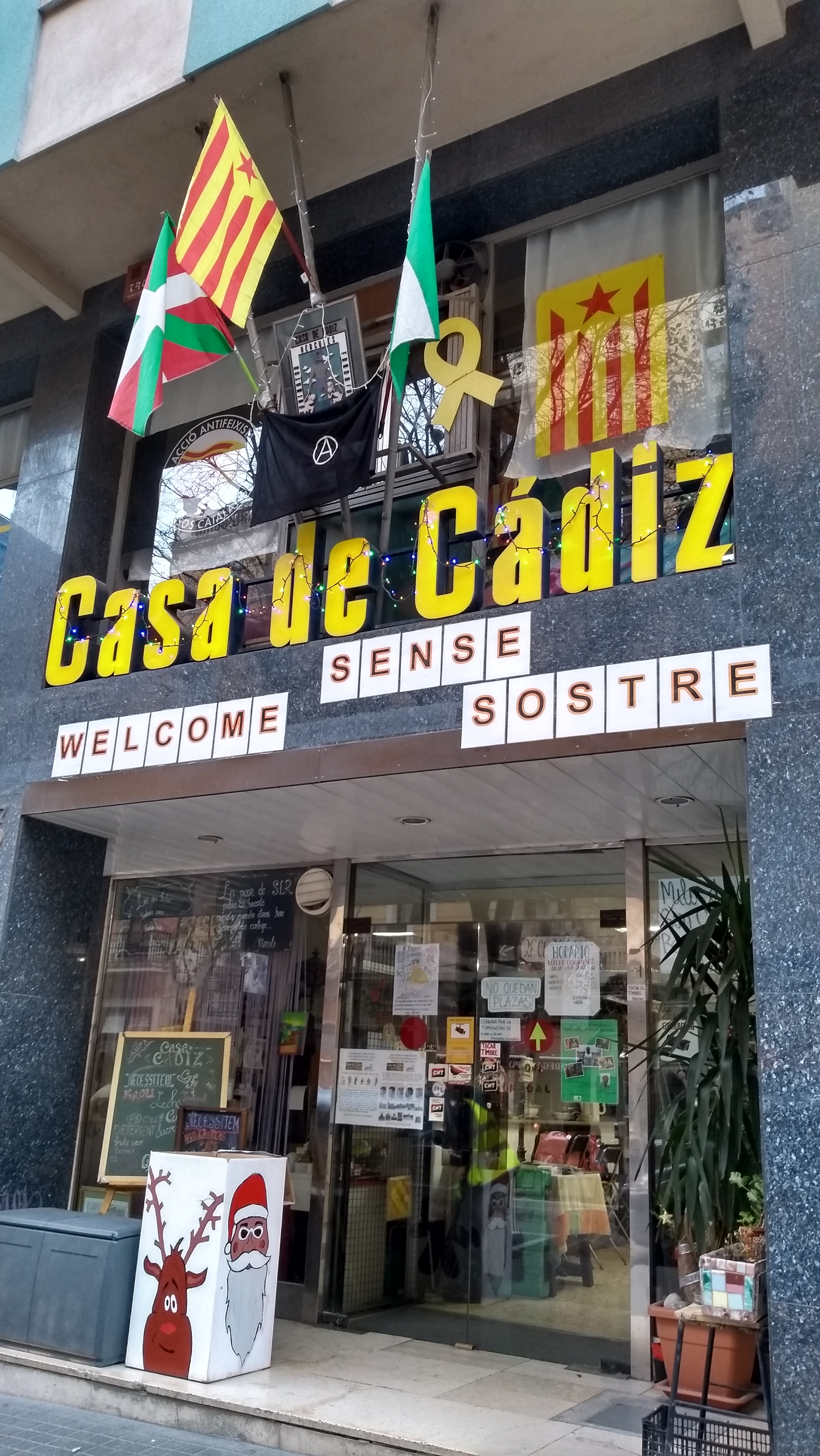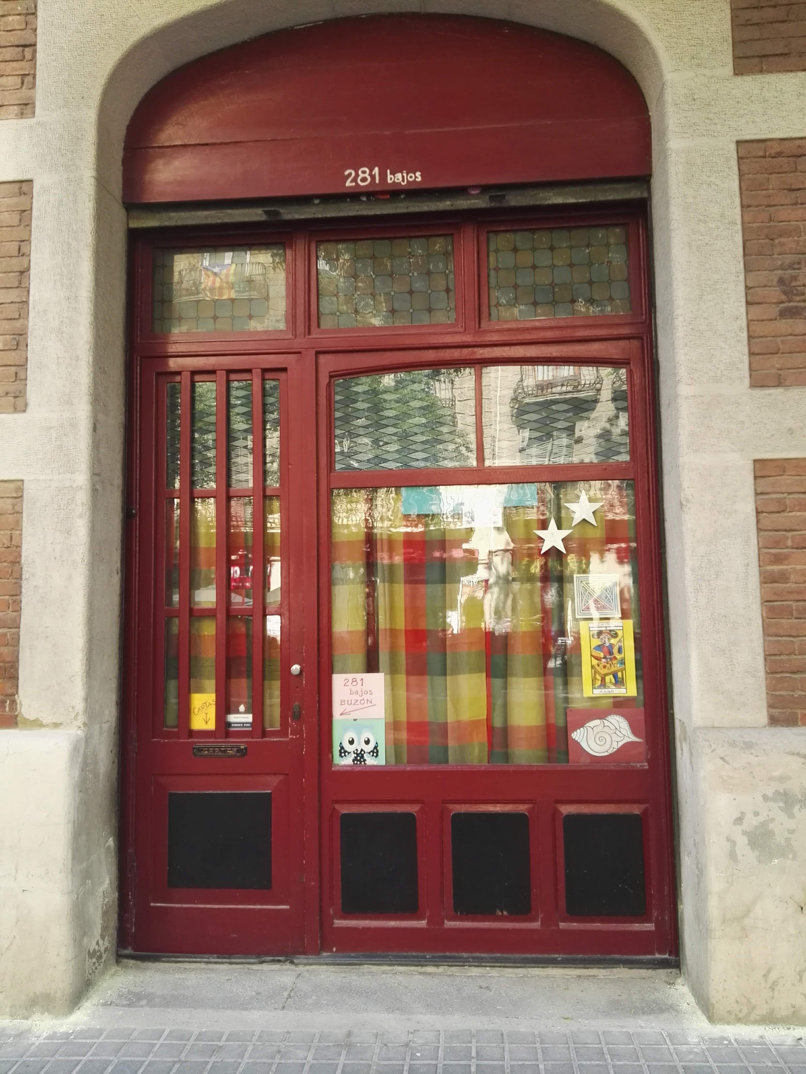 La casa ocupada de Dacín se ha integrado sin demasiada conflictividad en el barrio, aunque constituye un problema administrativo tanto para el Ayuntamiento de Barcelona como para el de Cádiz, presumiblemente propietario del local. Yo me había parado varias veces ante sus puertas de cristal tras las que veía, con pena, varios libros, fotos y estandartes gaditanos perder el color y arrugarse. De hecho, llamé a varias asociaciones y al propio Ayuntamiento de Cádiz para poner sobre aviso del deterioro del material. No pareció que le importarse a nadie un pimiento, así que lo dejé correr. Al poco tiempo, sucedió la ocupación. Y sucedió también otra pequeña historia que me volvió a llevar a las puertas del local. Para ser más exactos, a la puerta contigua. Me llamaba la atención lo que parecía ser la entrada de una vivienda a pie de calle. Puerta pintada de rojo con pegatinas y carteles de tarot en los cristales glaseados. Supe por Twitter, en la cuenta de Lagarder quien era el habitante de esa casa: