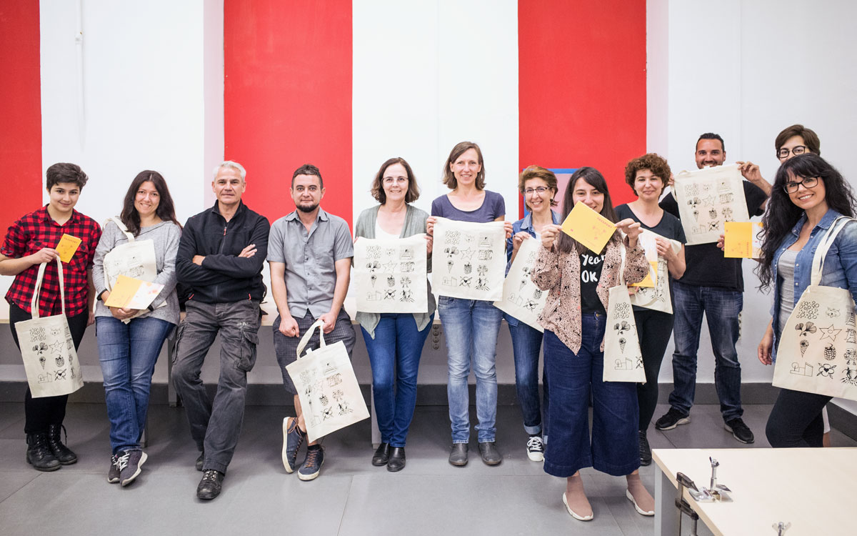 - Ejercicio práctico de estampación sobre papel (2 tintas) y tela (tote bag).