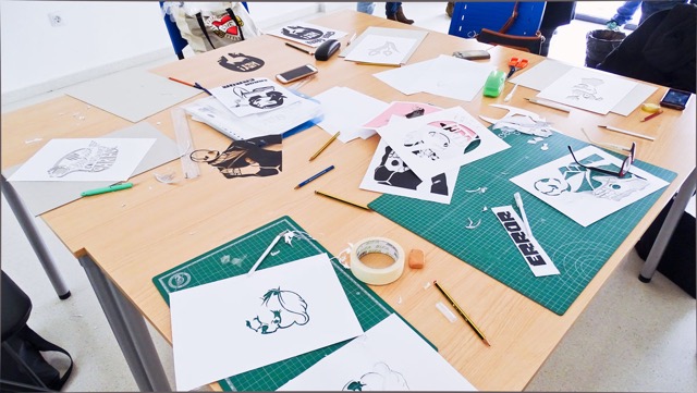 En este taller los alumnos aprenderán a trabajar y aplicar esta técnica. Posteriormente utilizarán los stencils como plantillas serigráficas que estamparán ellos mismos sobre una bolsa de tela (tote bag) que se llevarán de recuerdo. También darán así sus primeros pasos en el mundo de la serigrafía, método también empleado por el artista para la creación de obra gráfica.